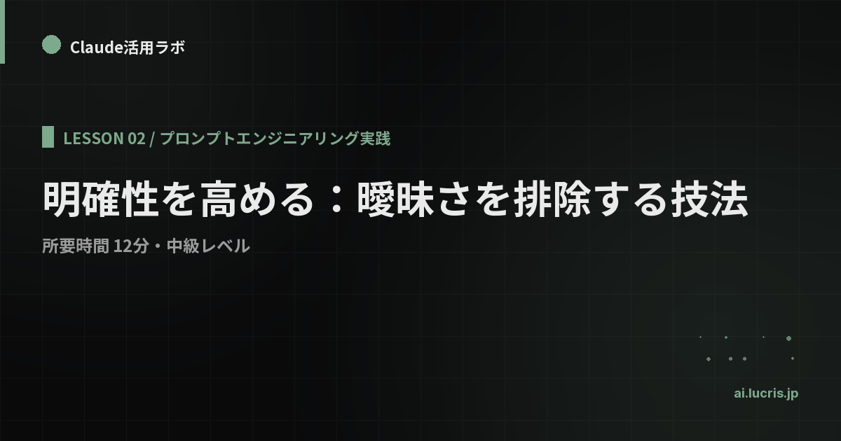 明確性は、他のすべてのテクニックの土台です。次のレッスンでは「構造化」、つまりXMLタグや見出しでプロンプトを整理する技法を学びます。